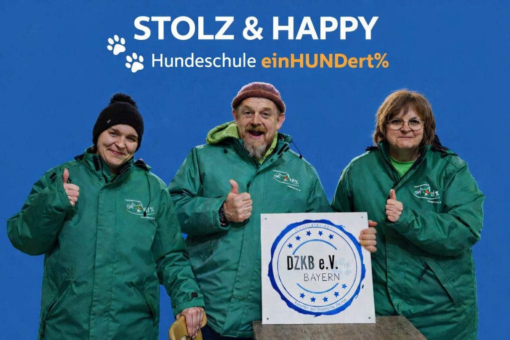 Die Hundeschule einHUNDert% wurde mit dem Gütesiegel des DZKB Bayern ausgezeichnet wurde. Dieses Qualitätssiegel steht für geprüfte Fachkompetenz, verantwortungsbewusste Ausbildungsmethoden und hohe Standards in der Hundeerziehung. Damit bietet einHUNDert% ihren Kundinnen und Kunden nicht nur engagiertes Training, sondern auch nachweislich zertifizierte Qualität.
